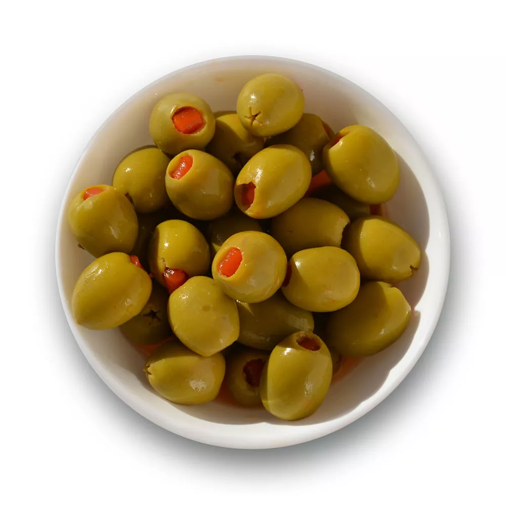Aceituna gordal rellena de pimiento rojo natural. 400 g.  Envasadas al vacío.