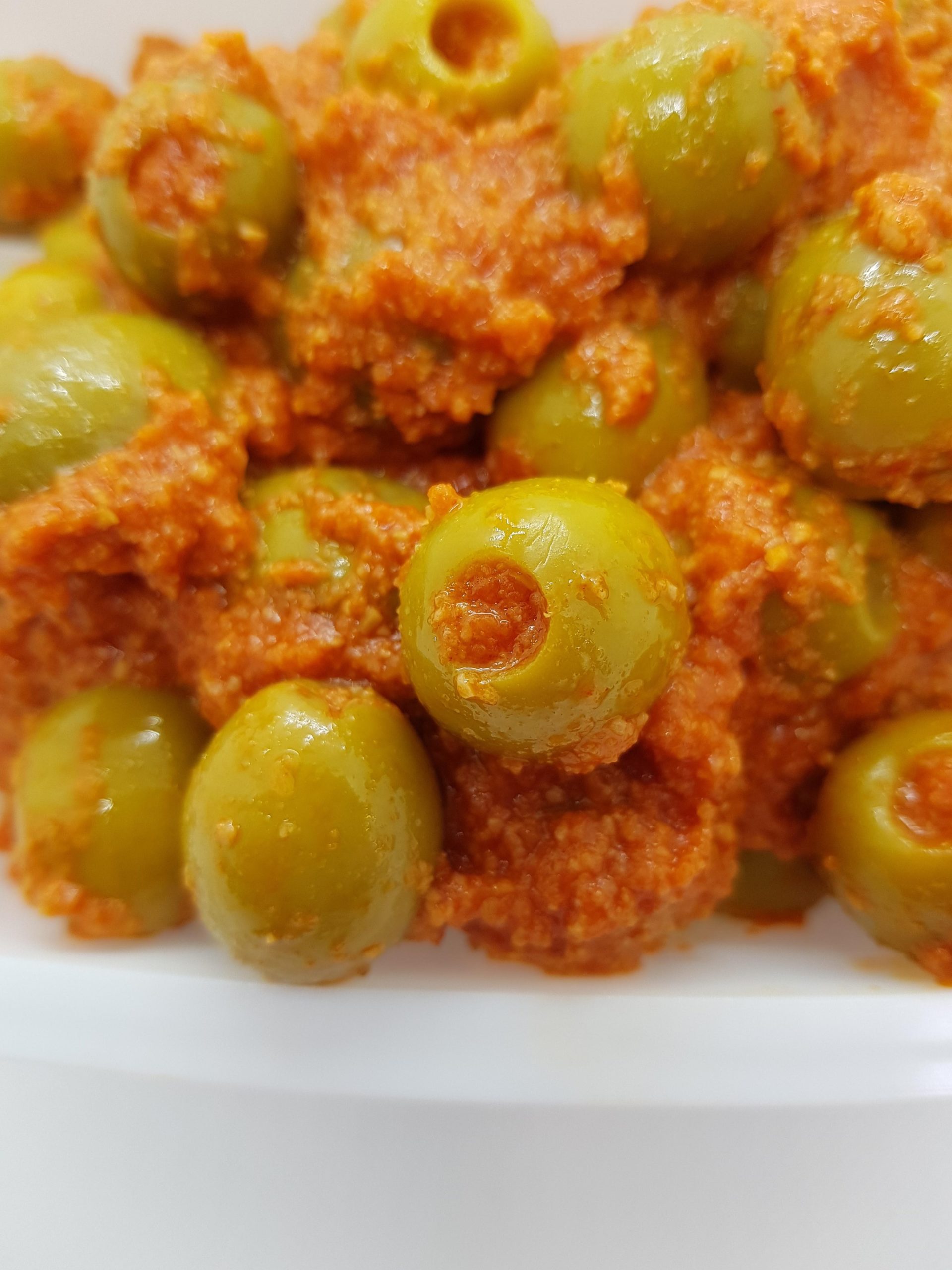 Fusionamos la receta de la salsa del romesco y la del mojo picón acompañándola de la mejor manzanilla deshuesada. Obtenemos así la joya de la corona de nuestras aceitunas.
