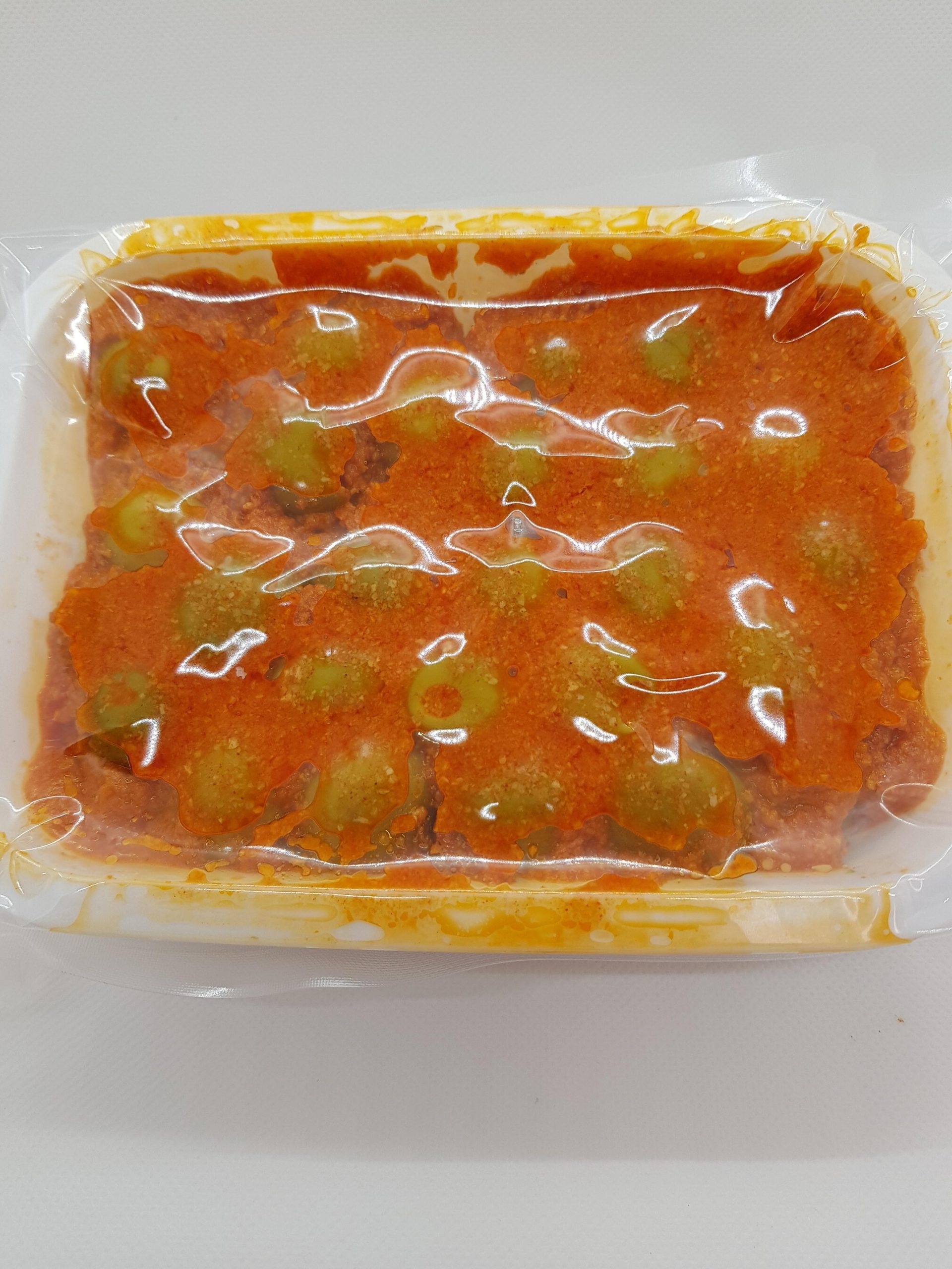 Esta aceituna se presenta envasada al vacío y con su salsa.