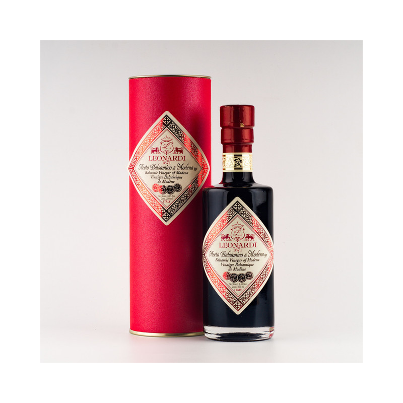 Vinagre balsámico envejecido durante 8 años pasando por diferentes barricas de maderas nobles como el roble, cerezo, fresno, castaño, morera y enebro. Este balsámico es de indicación geográfica protegida procedente de la Acetaia Leonardi en Magreta, Módena. El proceso para conseguir este exquisito vinagre empieza en la cosecha manual, pasando por el prensado suave de las uvas, hasta la cocción y envejecimiento del mosto, para acabar con la confección artesanal de cada botella.