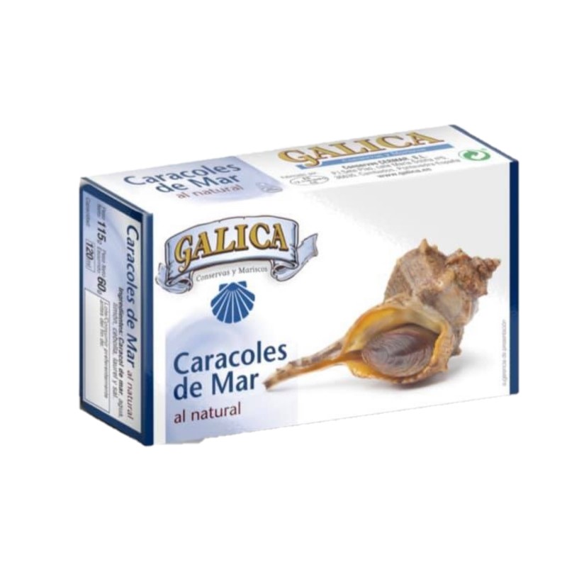 Conserva con caracoles de mar de las rías gallegas. Se cuecen al vapor antes de extraerlos de su concha y se enlatan manualmente con agua natural.