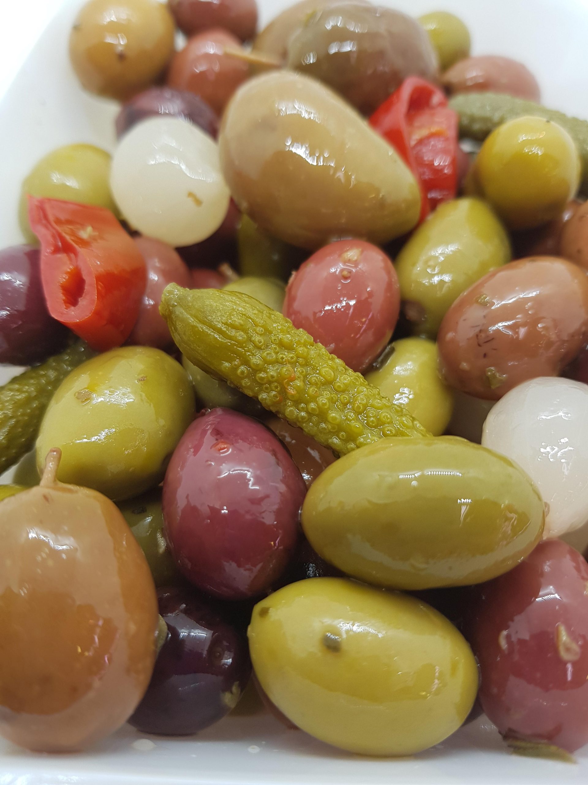 Selecta mezcla de aceitunas con hueso con pepinillo crujiente y cebollitas . Todo condimentado con hierbas del Mediterráneo peperoncino y aceite de oliva.