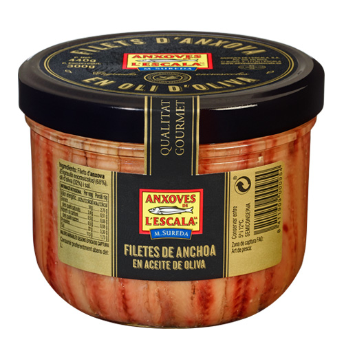 Anchoa procedente del mediterráneo. Fileteada y limpia en aceite de oliva. Frasco cristal 400 g.